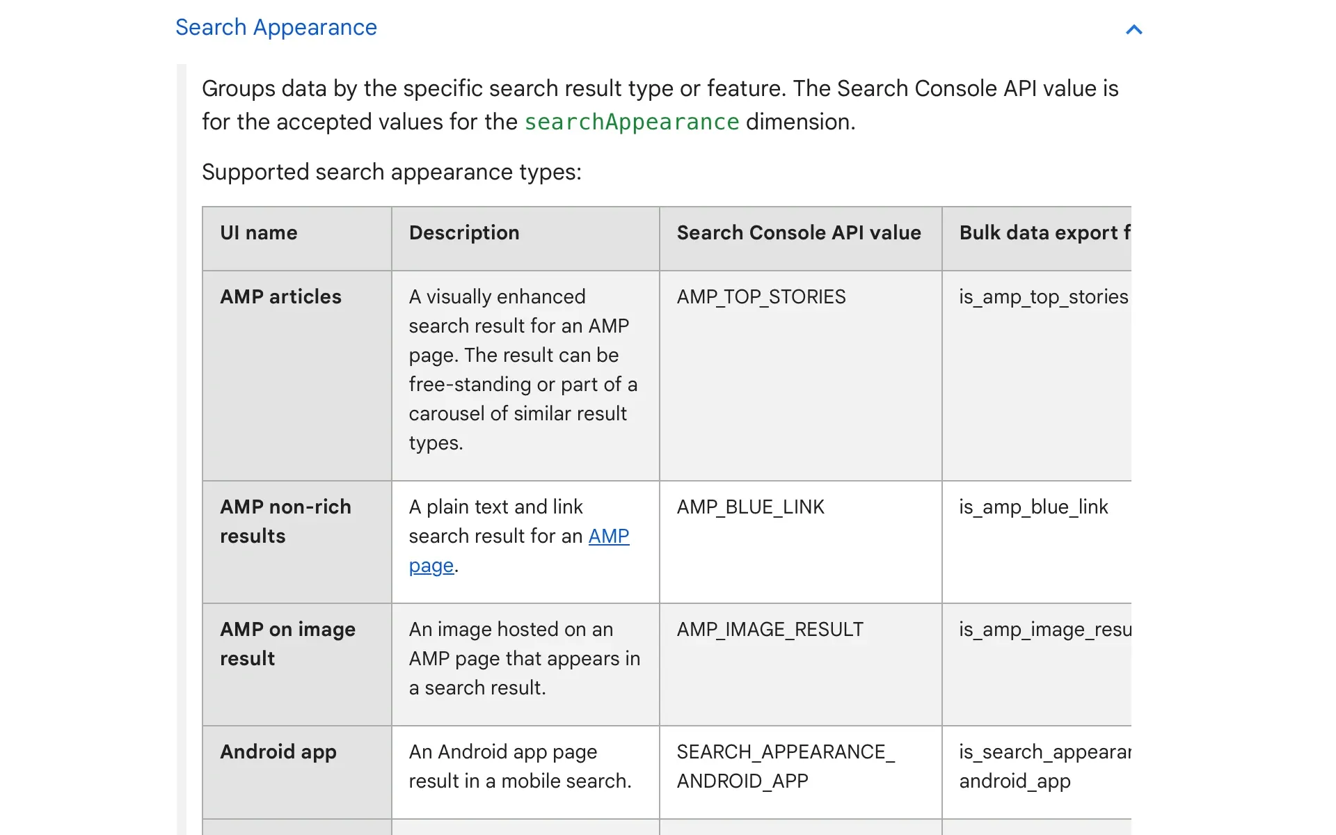 - La mise à jour inclut une nouvelle table détaillant les types d’apparences de recherche, les valeurs API et les champs d’exportation de données en vrac.
